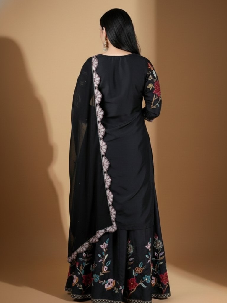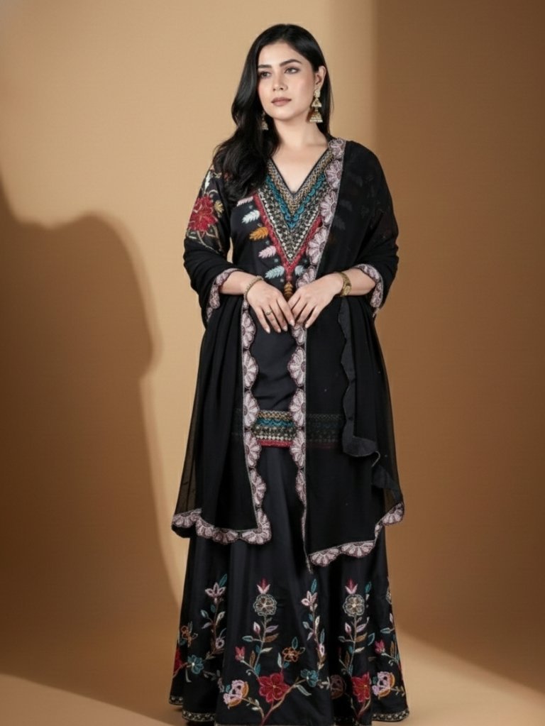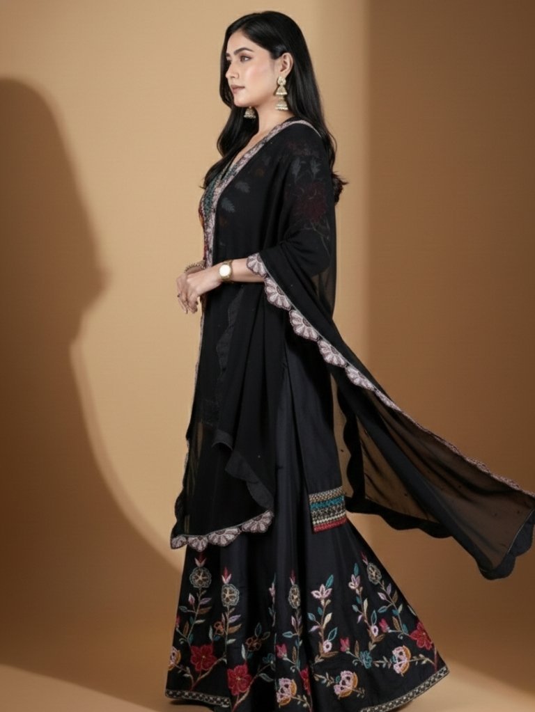 This black ethnic set features rich multicolor floral embroidery that adds a bold and elegant statement.