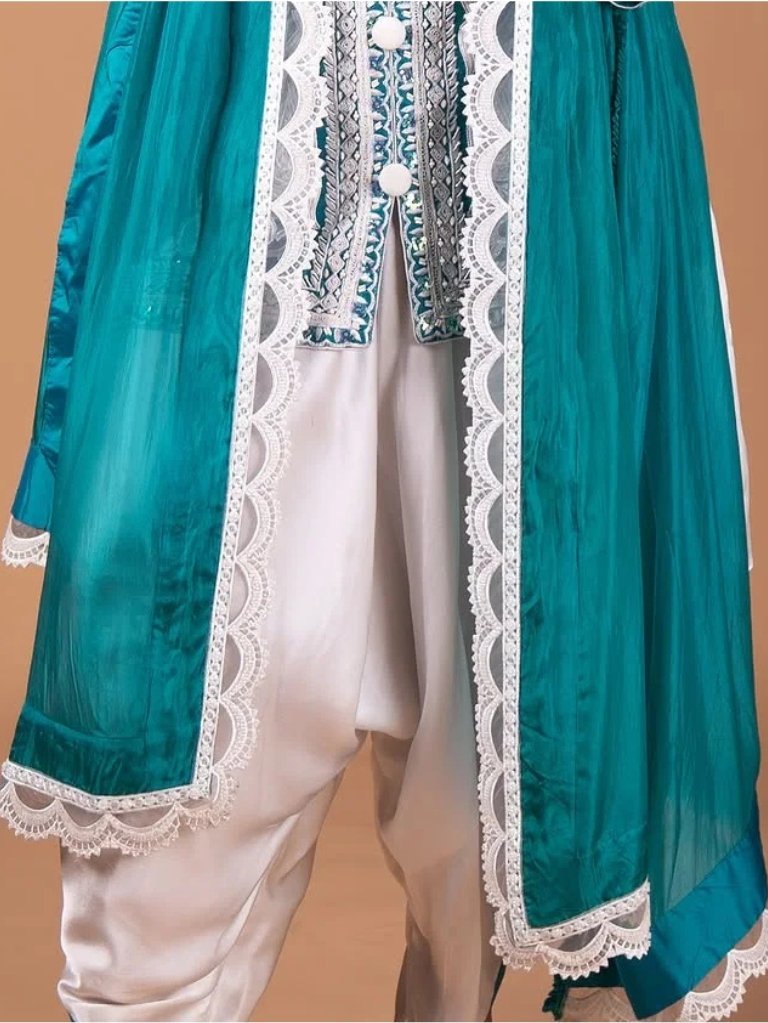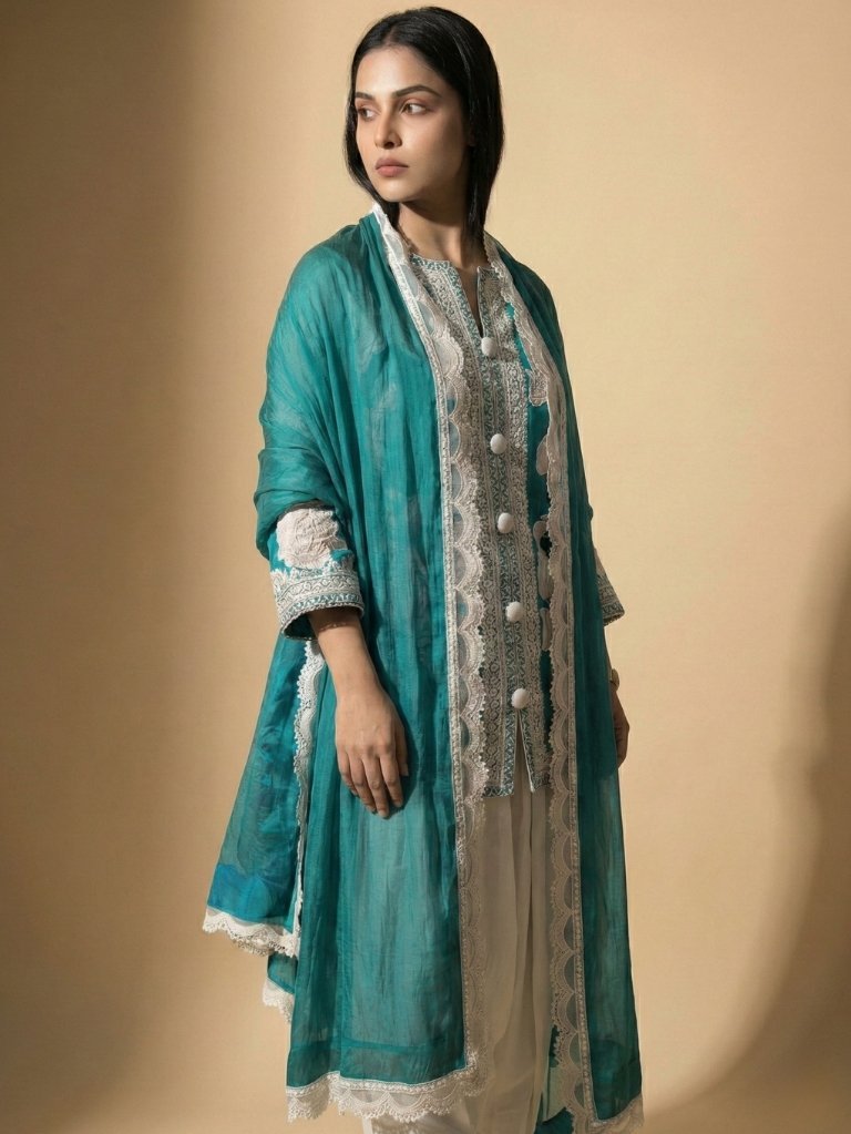 This teal embroidered kurta set features intricate lace borders that add a refined, handcrafted look.