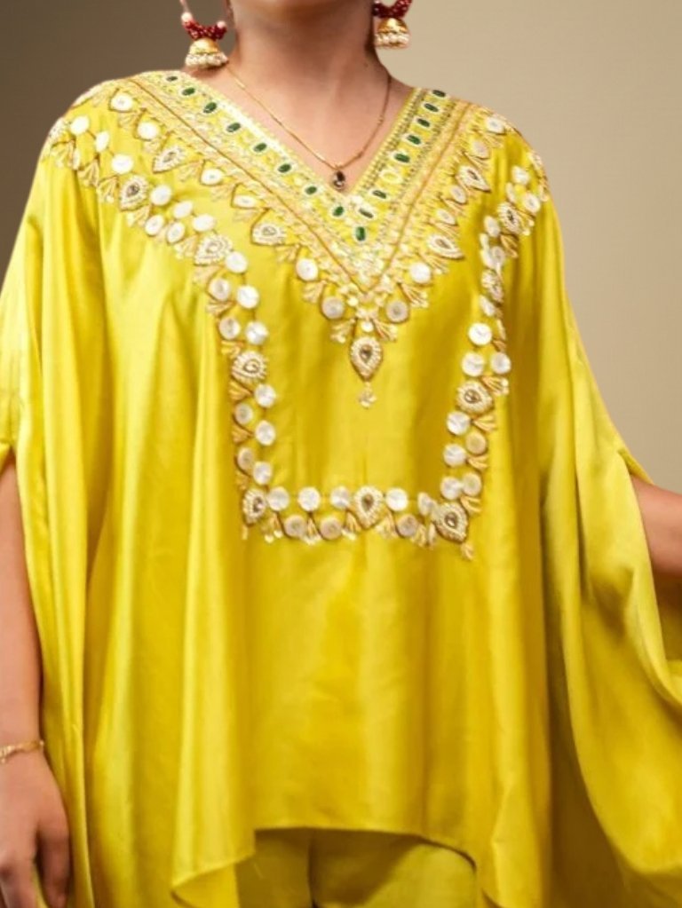 This bright yellow kaftan set features stunning mirror-work embroidery around the neckline and borders.